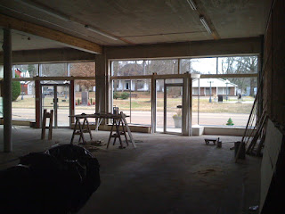So there were some delays. I started ripping out my glass and the entire frame around my storefront the week after Christmas. I took a week of vacation to get everything done, and made great headway, until it started raining, and the new glass order was delayed. I was going to try putting my original glass back in place for the big panes, but after breaking one while taking it out (it was under so much pressure in the torqued frame it cracked after I released the first clip) and then trying to cut down the sheets to fit my newly-square and plumb openings without success, I bit the bullet and ordered all new tempered. The pictures are in no particular order, but right here is a night shot after the glass is completely installed, including my lovely new transom windows. To see what it looked like when I started, scroll down a few posts. (And to put this in perspective, the store is 50 feet across, and the top of the transom windows are about 12 ft up.)