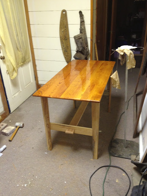 Another table I whipped together. This is made entirely from the ceiling boards from the BTC. When the building was first retro-fit with electricity, two channels of the tongue and groove 6" ceiling boards were removed in parallel lines from the front to the back of the first floor, wires were run, and the boards were hatcheted, (literally,) to make them fit back in place. When I rewired and replaced the light fixtures, I removed the butchered boards and replaced them with straight-edged pieces.