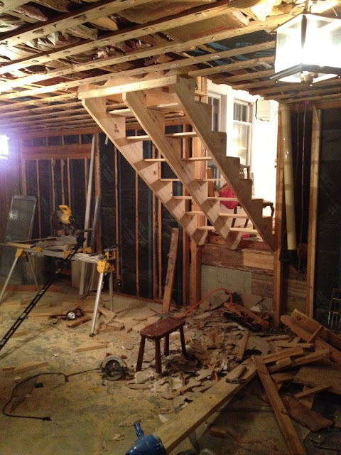 The toilet is out on the front porch. A necessary badge for any house under construction/renovation. The temporary pine treads will be replaced with oak as soon as the dark tung oil dries.